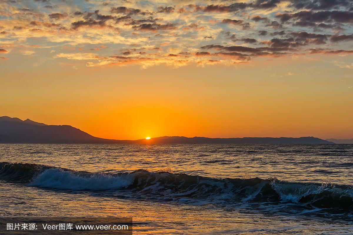 清晨,壮观的日出越过大海和高山.摄于希腊阿斯普罗瓦尔塔.