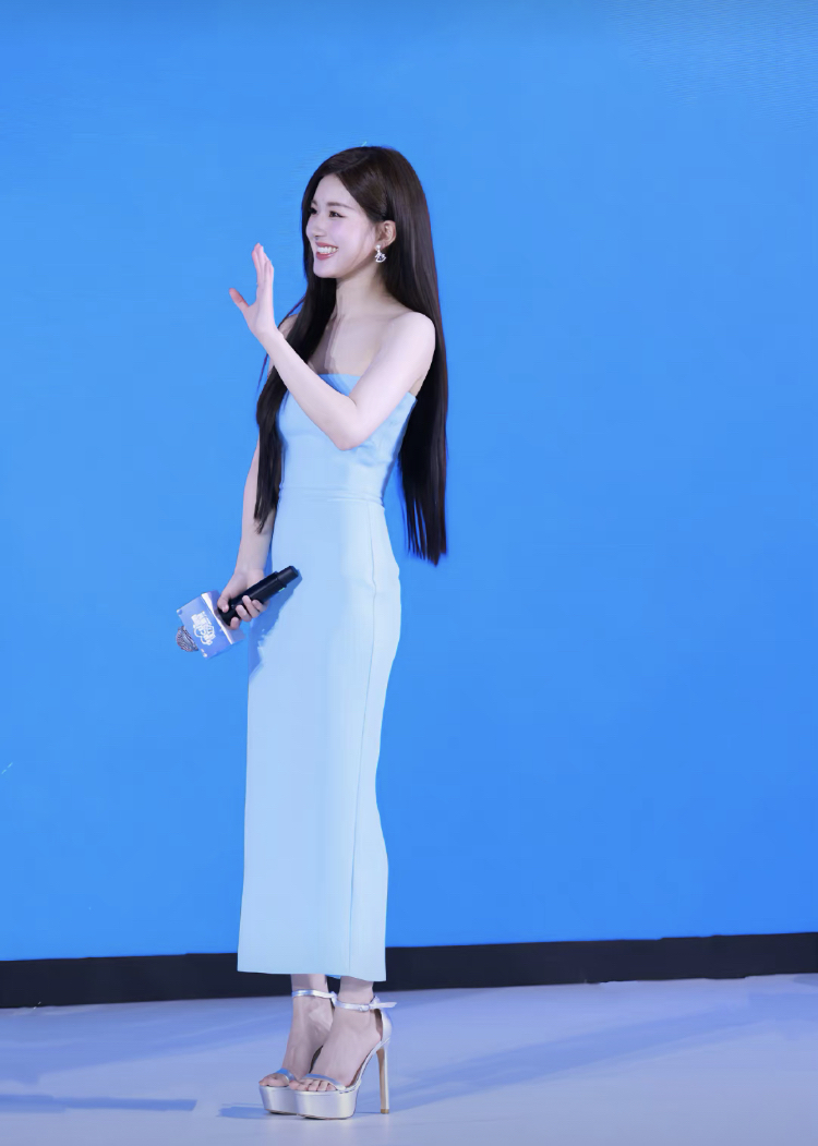 赵露思广州见面会,穿蓝色抹胸裙,配一字带高跟真好看