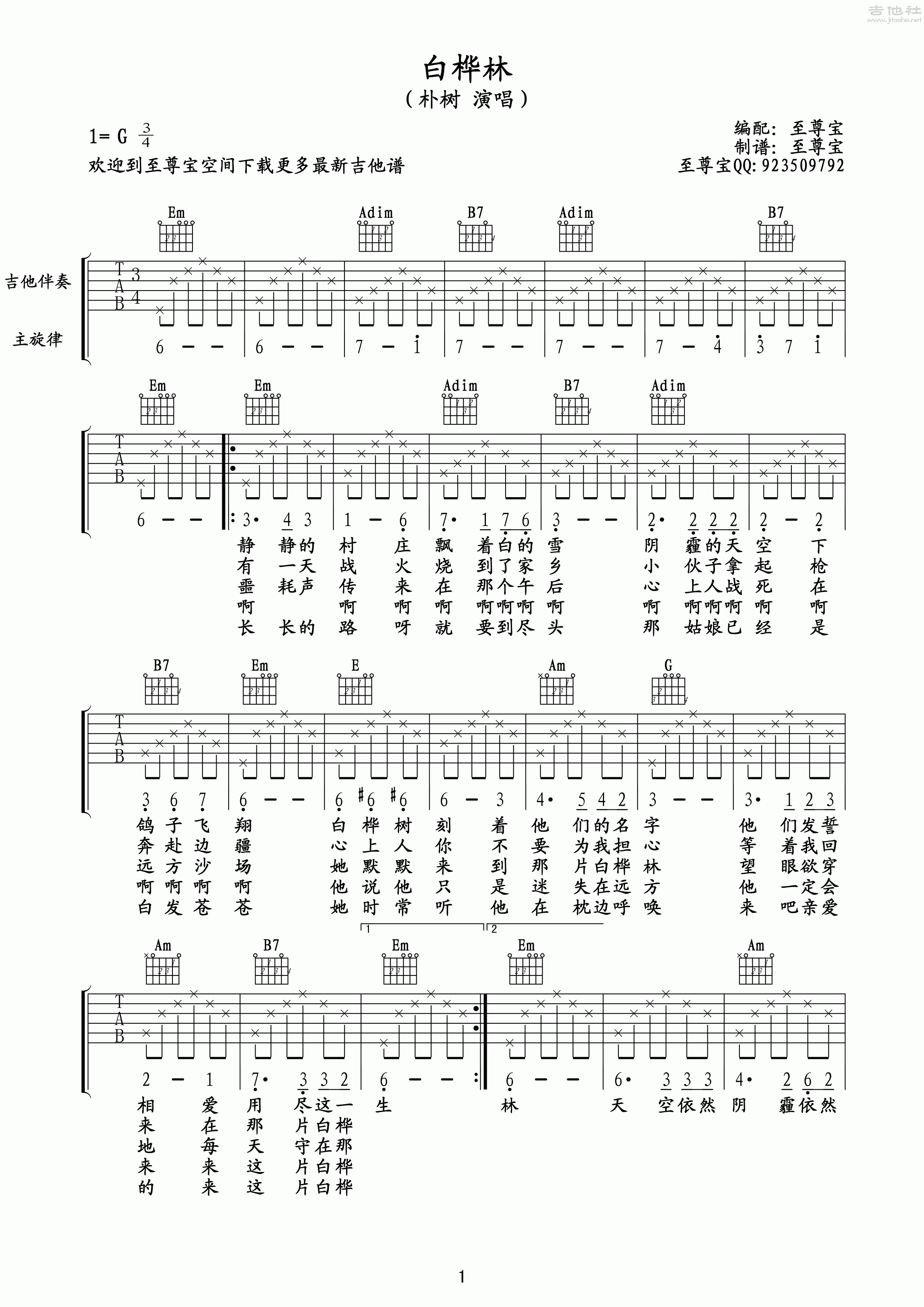 朴树-白桦林吉他谱-弹唱六线谱-1