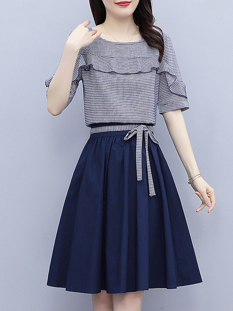 五分袖中长裙女士夏款新品女装a字裙单排扣中腰v领纯色时髦连衣裙