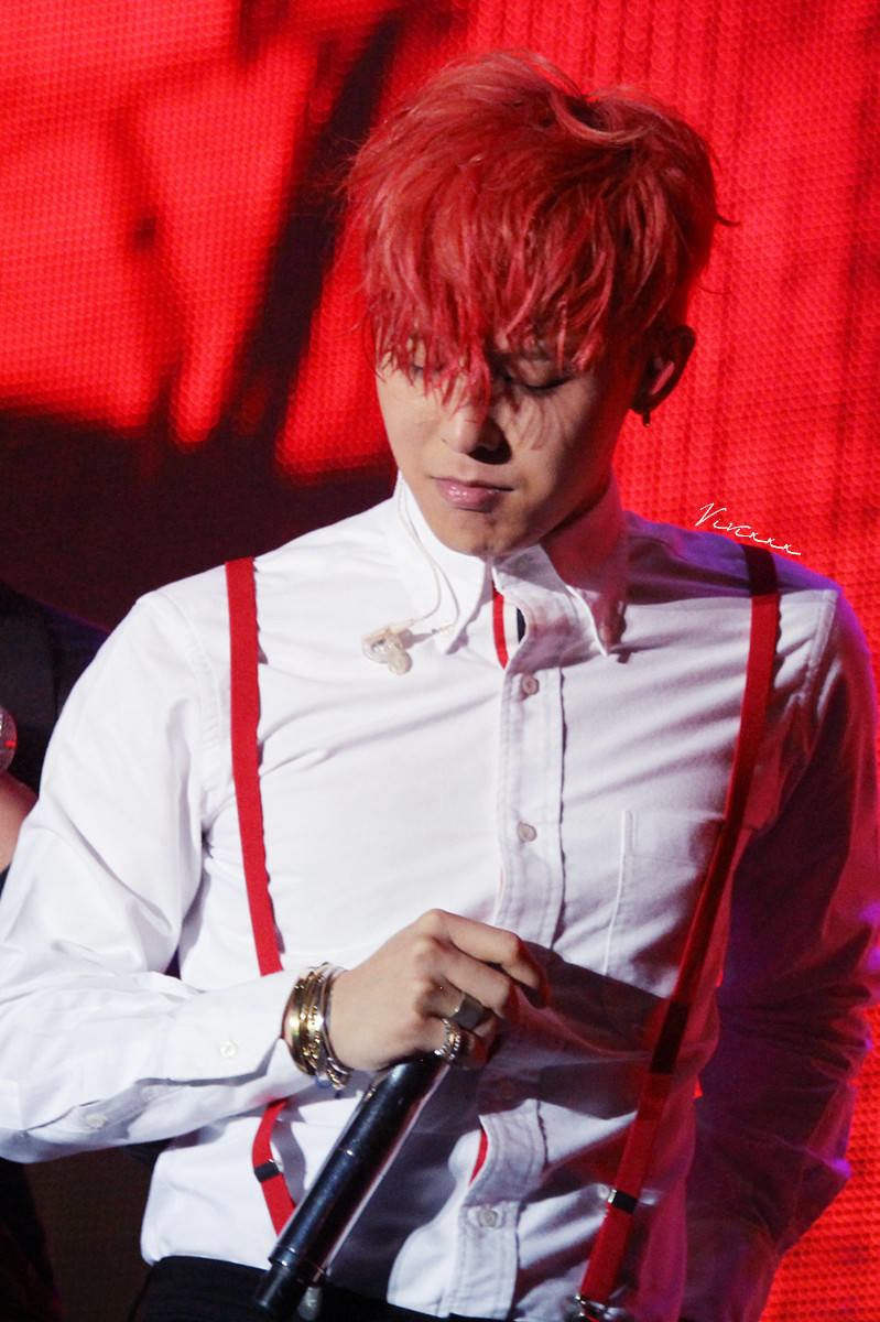 当天他穿一身大红look卖力开唱. 权志龙红头发全身红衣服红红火火!