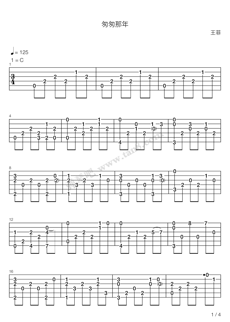匆匆那年吉他谱-王菲-指弹版高清六线谱图片谱