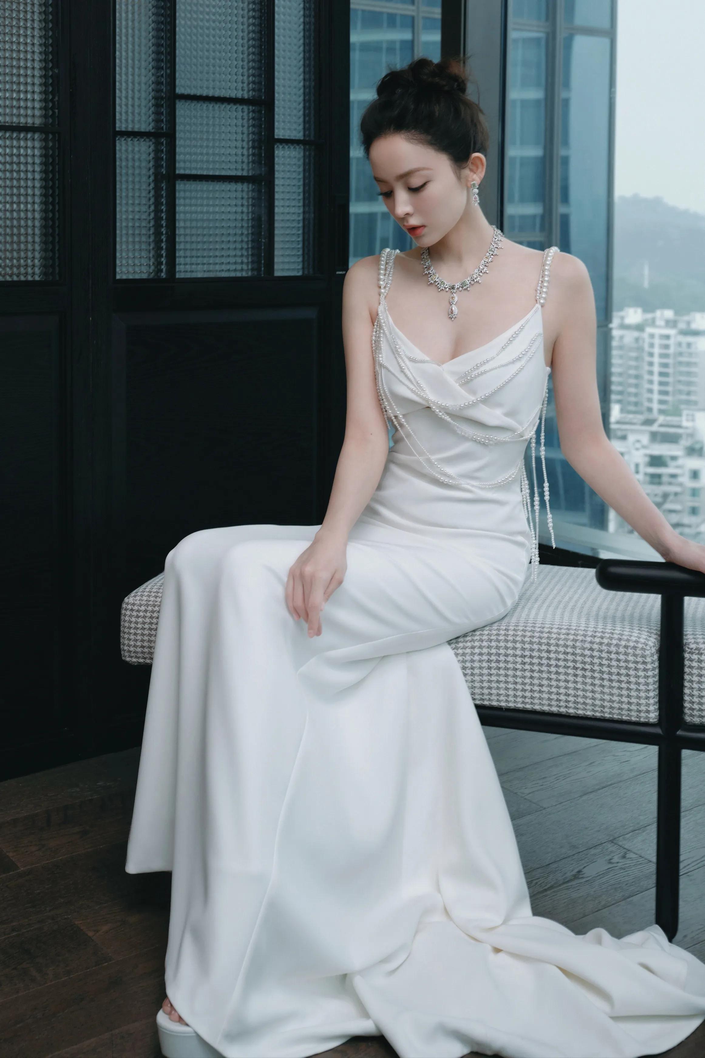 女神古力娜扎,白色包臀礼服,好有贵妇气息.
