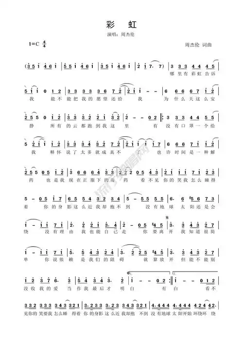 歌曲简谱周杰伦彩虹免费高清简谱歌谱下载流行弹唱网
