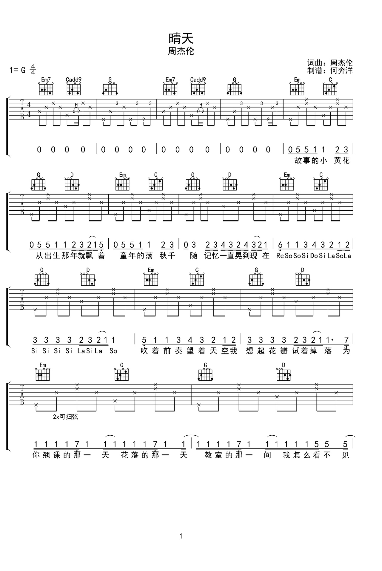 周杰伦晴天原版g调吉他谱周杰伦晴天流行弹唱吉他谱