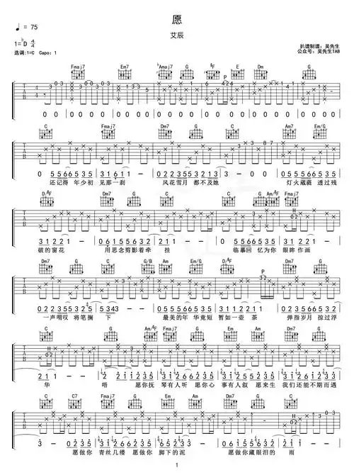 愿吉他谱_艾辰_c调弹唱谱_高清六线谱2