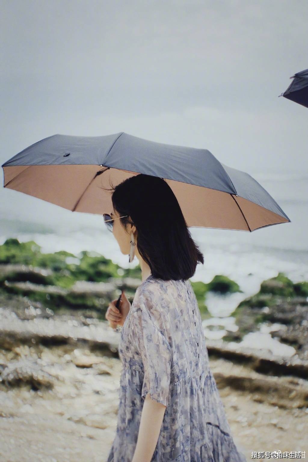 景甜穿碎花纱裙美丽大方一头短发飘逸灵动海边漫步气质优雅