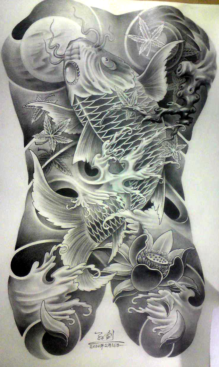 满背招财鱼未完待续_纹身图案手稿图片_王志勇的纹身作品集