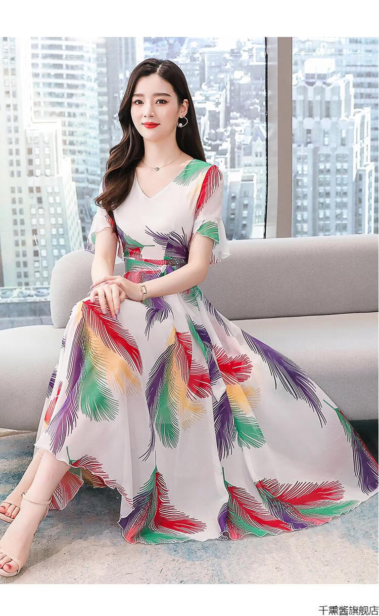 实拍2032#2019夏季新款连衣裙修身气质v领大摆雪纺沙滩连衣长裙