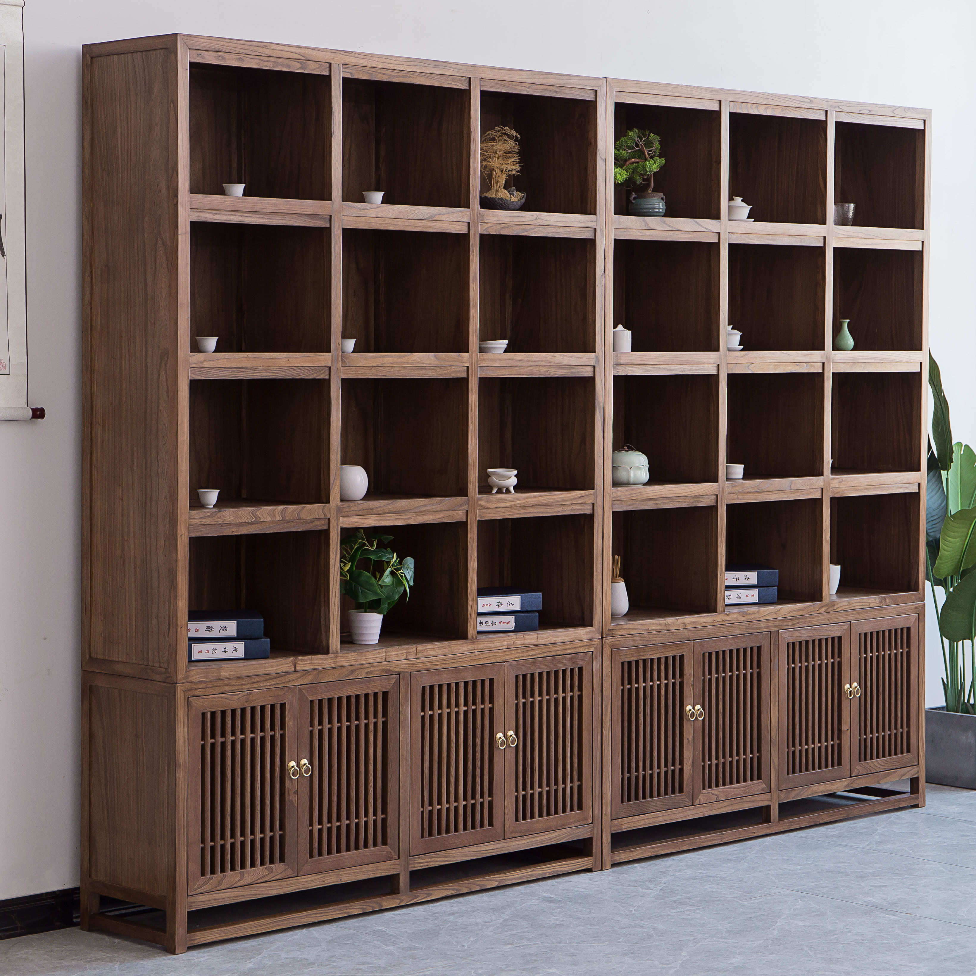 黑胡桃木现代中式书柜组合新中式实木老榆木展柜禅意展示柜陈列柜
