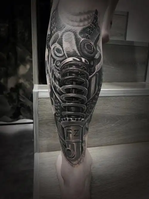 机械小腿纹身图片_腿部欧美写实原创机械黑灰纹身图案