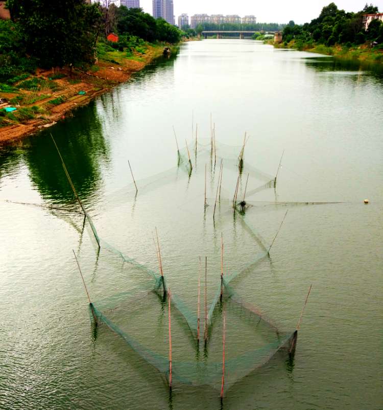 的水域里分布着好几处细密的鱼网和竹竿,据了解,这是捕鱼的"迷魂阵"