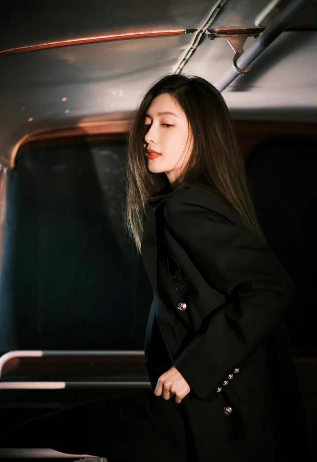 江疏影穿黑色西装配微喇长裤拍写真,知性大方,女神范儿十足
