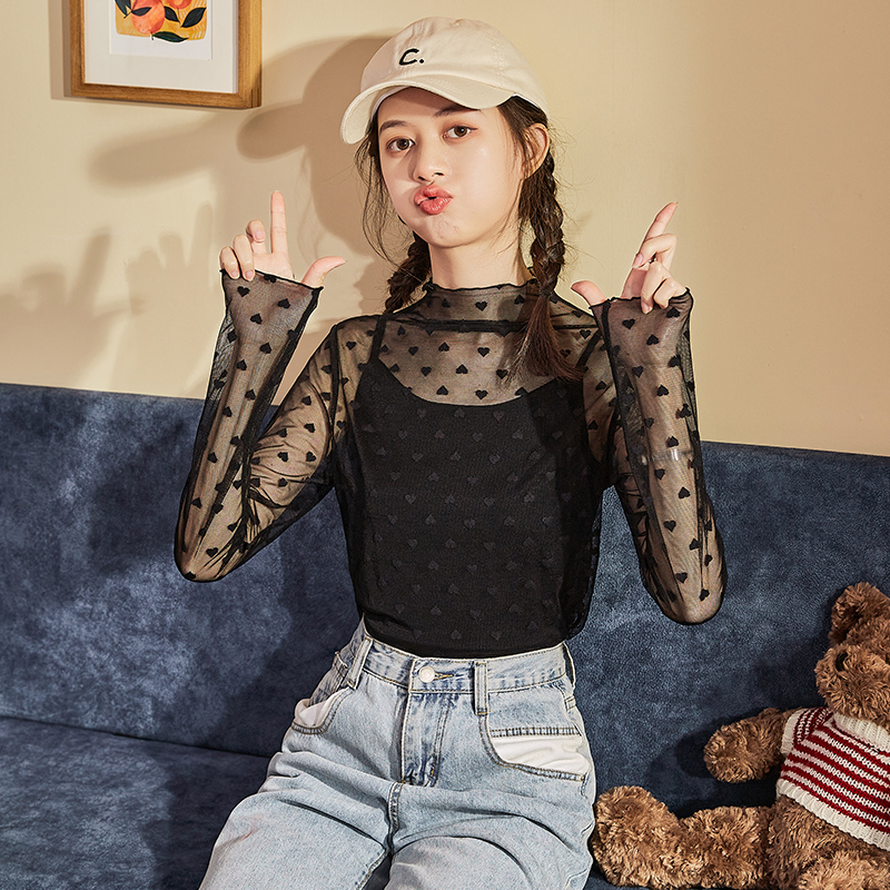 春装好看洋气t恤半高领网纱蕾丝拼接上衣打底衫女长袖2024新款