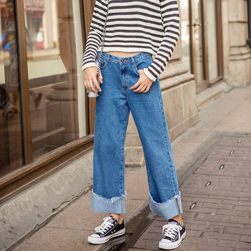 秋冬2016新款高腰九分裤阔腿牛仔裤女休闲宽腿裤卷边宽松下装