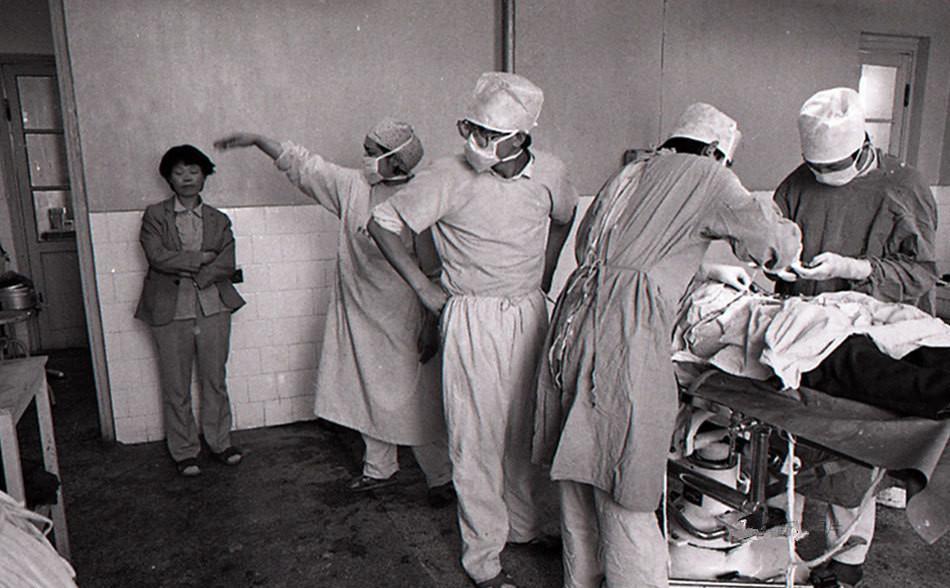 图中是90年代中期的医院中,几位医生正在给一名青年男性做结扎手术.