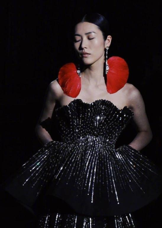 原创刘雯走秀又惊艳了!穿暗黑风透视裙气场强大,羽毛扇耳环看服我了