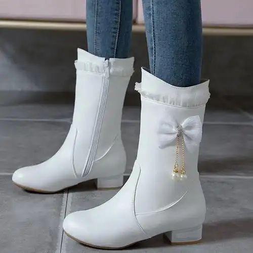 女童长靴子秋冬儿童公主靴加绒蝴蝶结高筒靴白色中大童表演出单靴白色