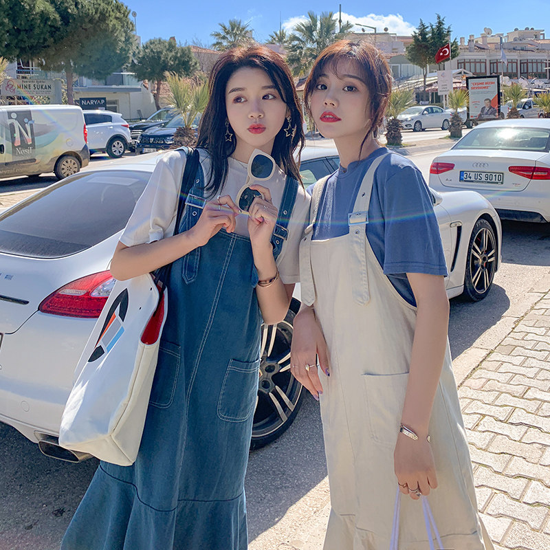 闺蜜套装牛仔姐妹装一对背带短裙裤两件套连衣裙子夏学生一短一长