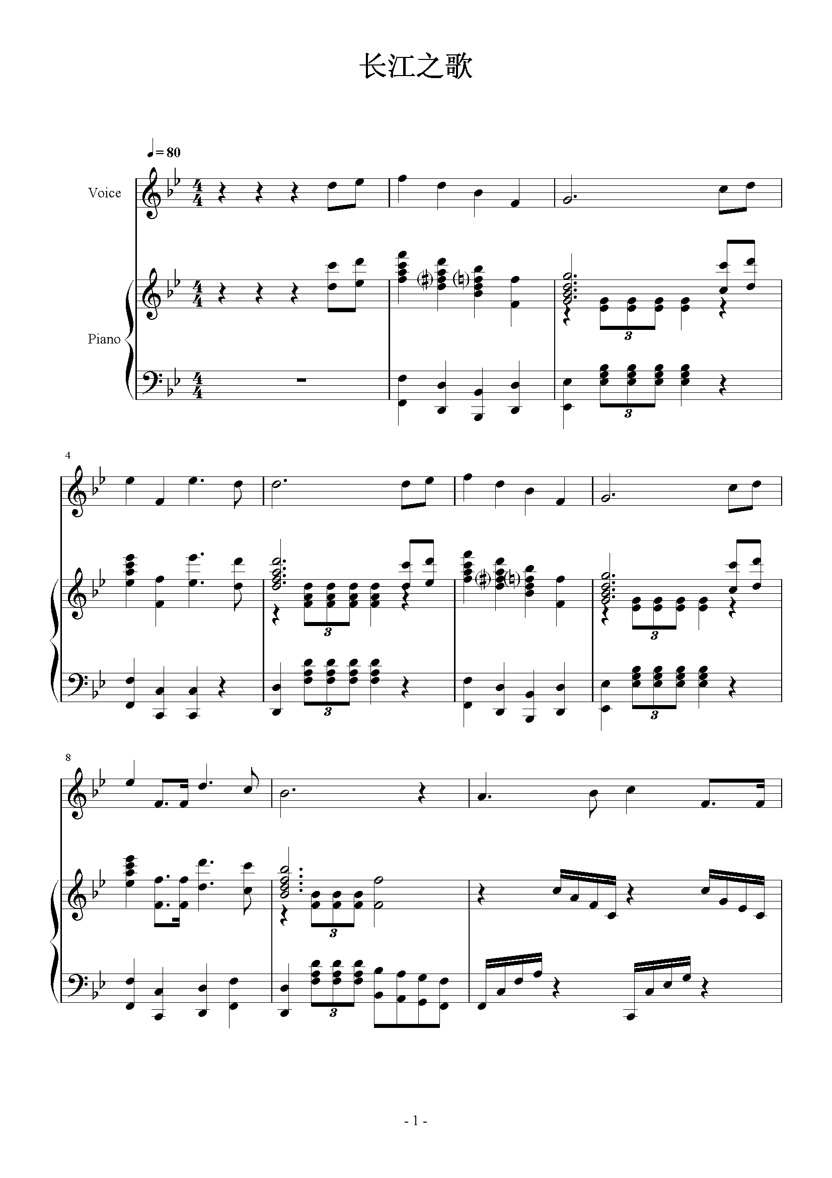 长江之歌钢琴谱季小琴降b调钢琴弹唱五线谱