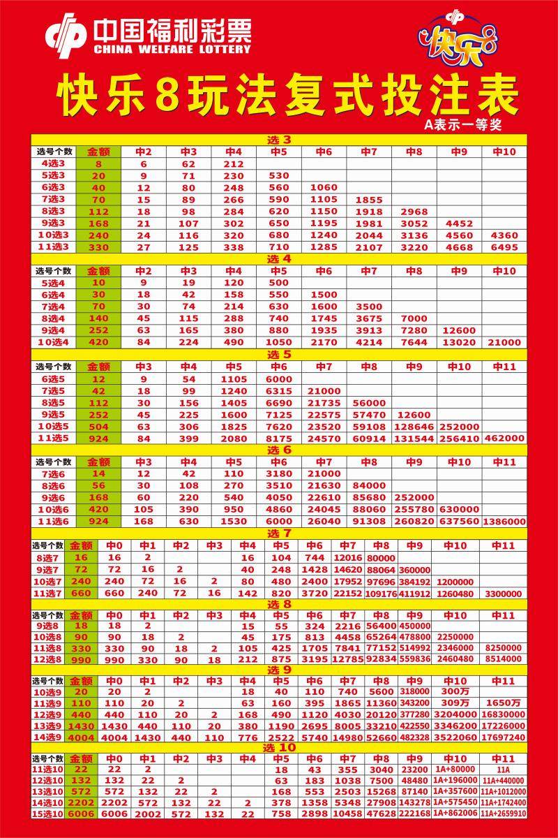 投注参考实用对照表彩票快乐8游戏玩法规则投注参考快8奖级表复式