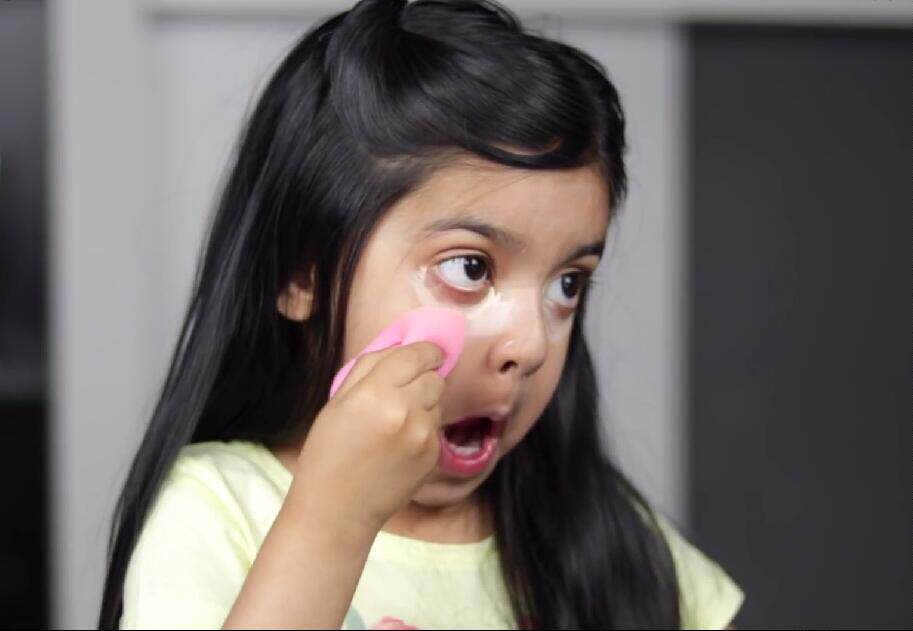 接着,她很干脆利落地在她的黑眼圈上涂上了一大笔遮瑕液,用海绵蛋轻轻
