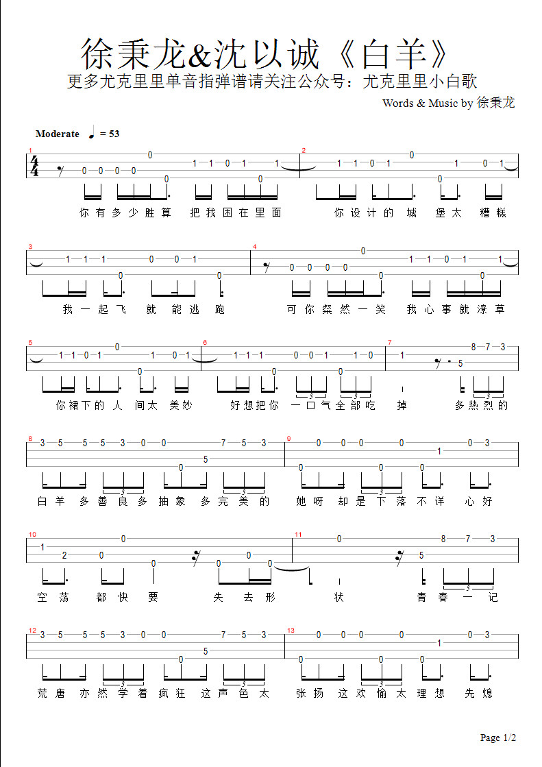 徐秉龙沈以诚白羊尤克里里谱指弹单音谱