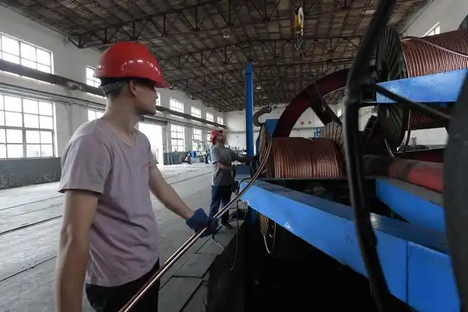 图为兴盛山鹰线缆有限公司工人正在生产电缆.