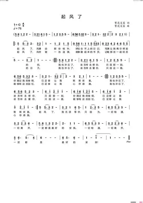 起风了简谱-李繁花演唱-李繁花曲谱1