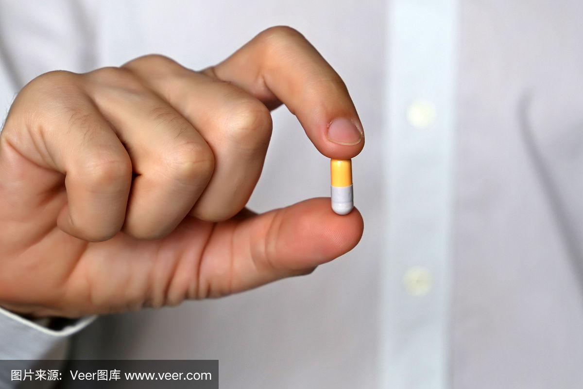 维生素补充剂的概念.男性手中拿着药瓶或维生素.成人复合维生素.