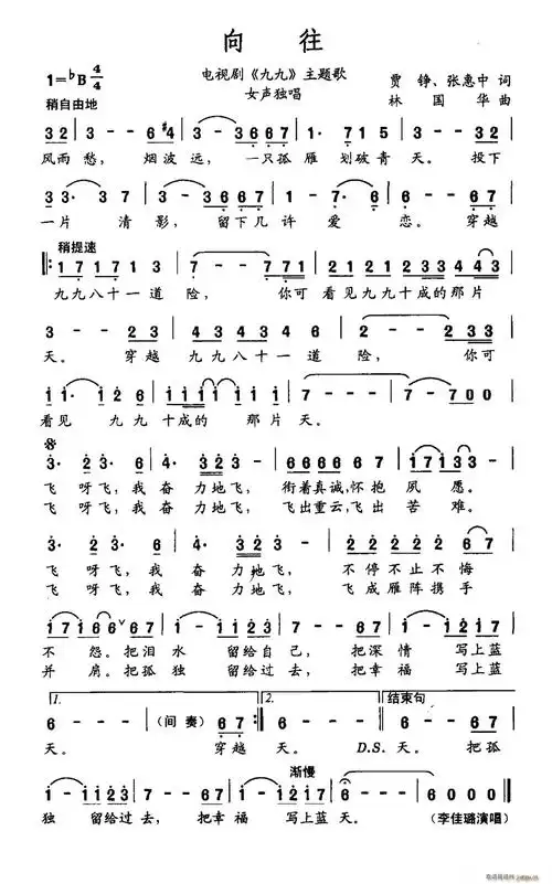 向往(电视剧《九九》主题曲) 李佳璐 歌谱简谱网
