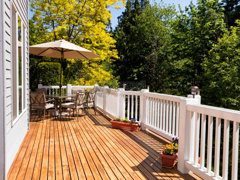 室内户外雪松甲板配有家具和露天伞在明亮的白天水平布局高清图片下载