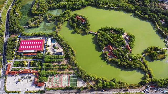 航拍|甘肃高台月牙湖公园湖面如镜春意浓 高台月牙湖公园