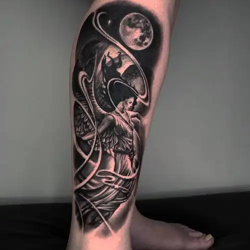 小腿黑灰天使纹身图案