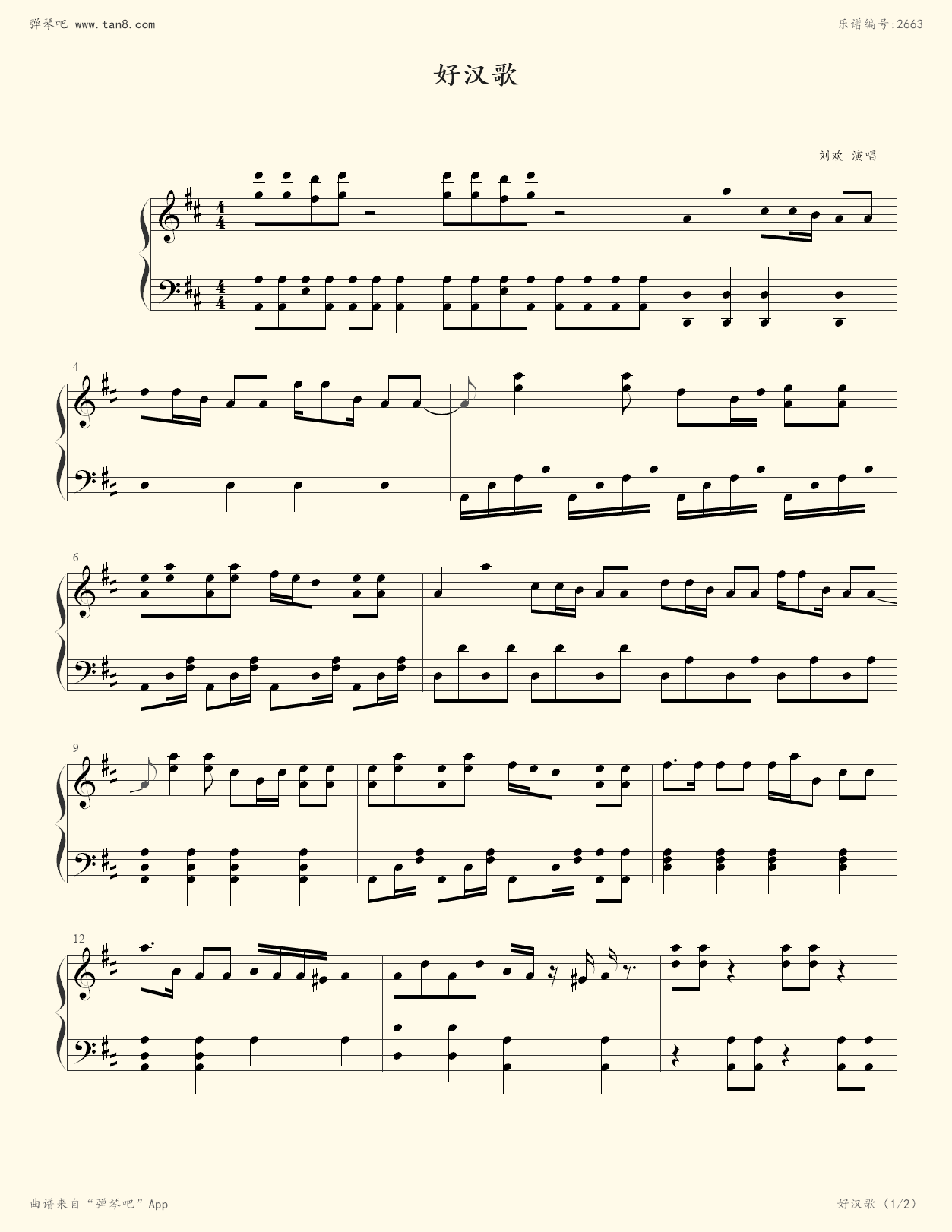 《好汉歌 d大调 简易版 ,钢琴谱》(五线谱 钢琴曲 指法)-弹吧|蛐蛐