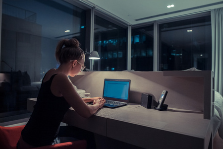 办公室工作过度女青年在办公室工作过度自由职业者熬夜工作笔记本电脑