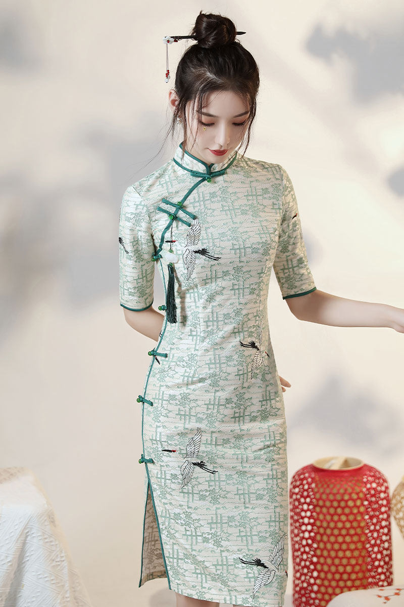 旗袍2021年新款秋冬季气质绿色刺绣国风改良加绒加厚长袖冬装毛呢