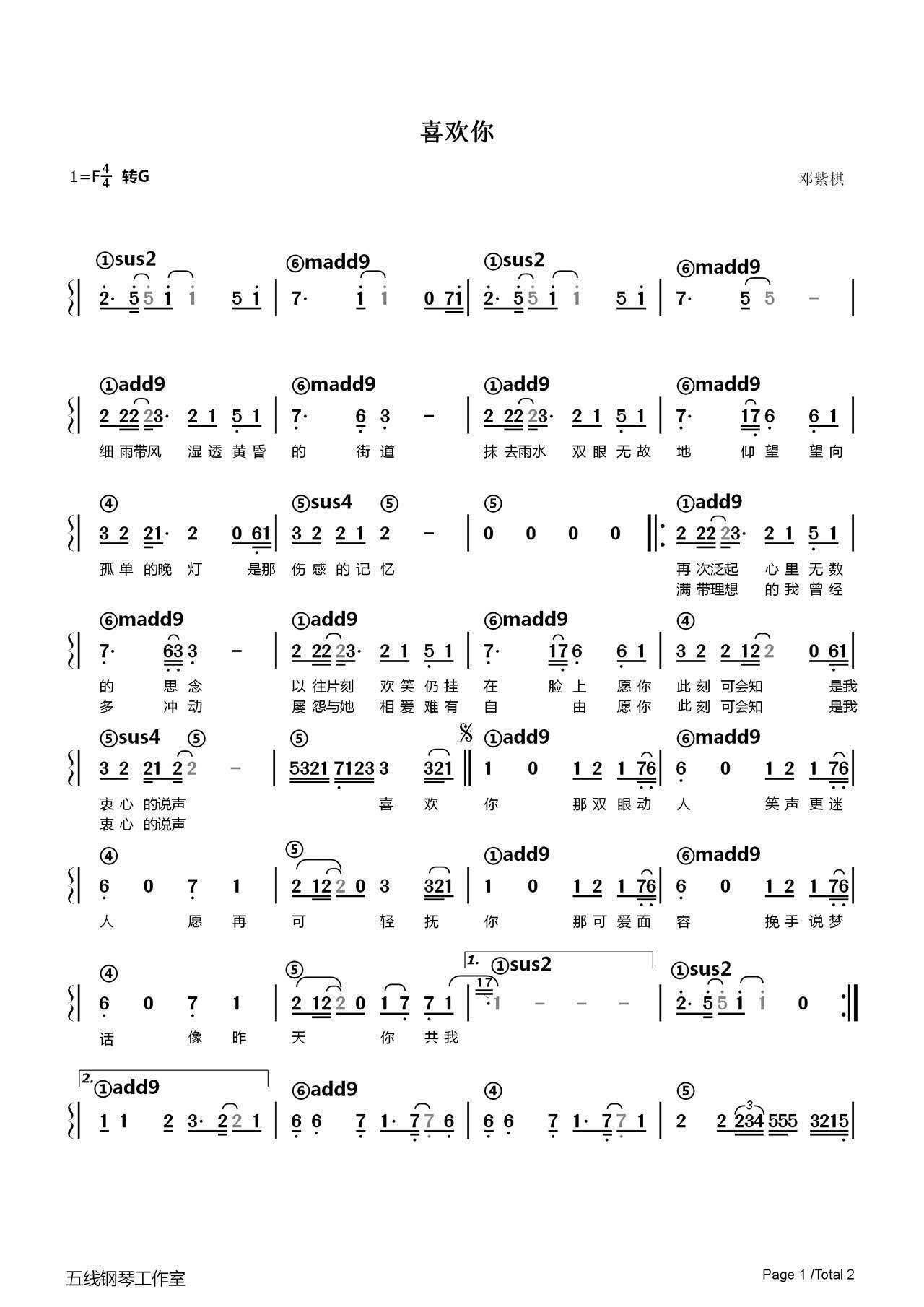 喜欢你简谱(歌词)-邓紫棋演唱-桃李醉春风记谱1