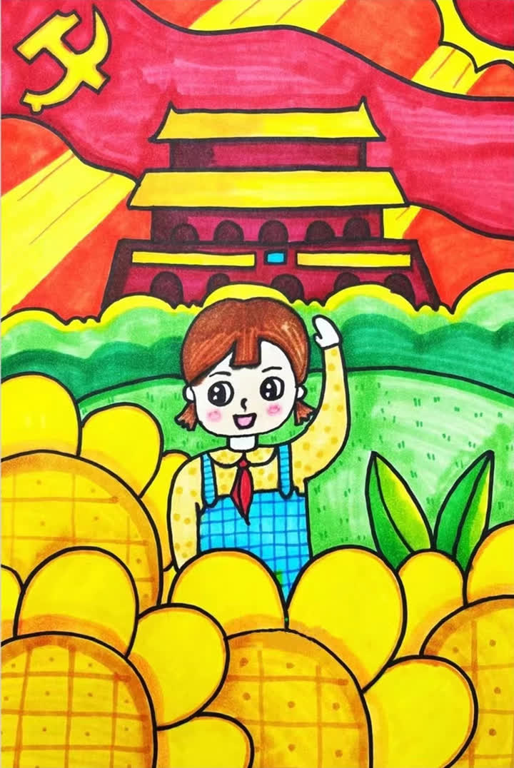 儿童绘画作品七:《党旗下的少年》作者:王子睿指导老师:刘梦
