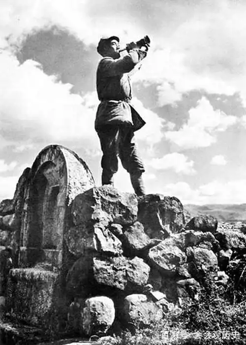 抗战时八路军战士吹冲锋号照,站高处吹响冲锋号,看着就激动人心