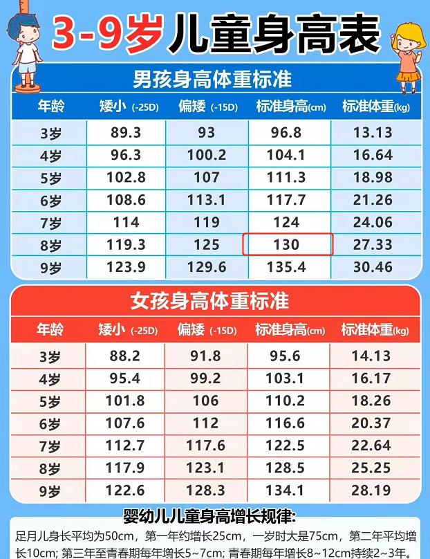 儿童身高标准表出炉8岁孩子不低于130你家娃达标没