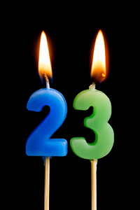 燃烧蜡烛的形式为23二十三 (数字, 日期) 的蛋糕孤立的黑色背景.