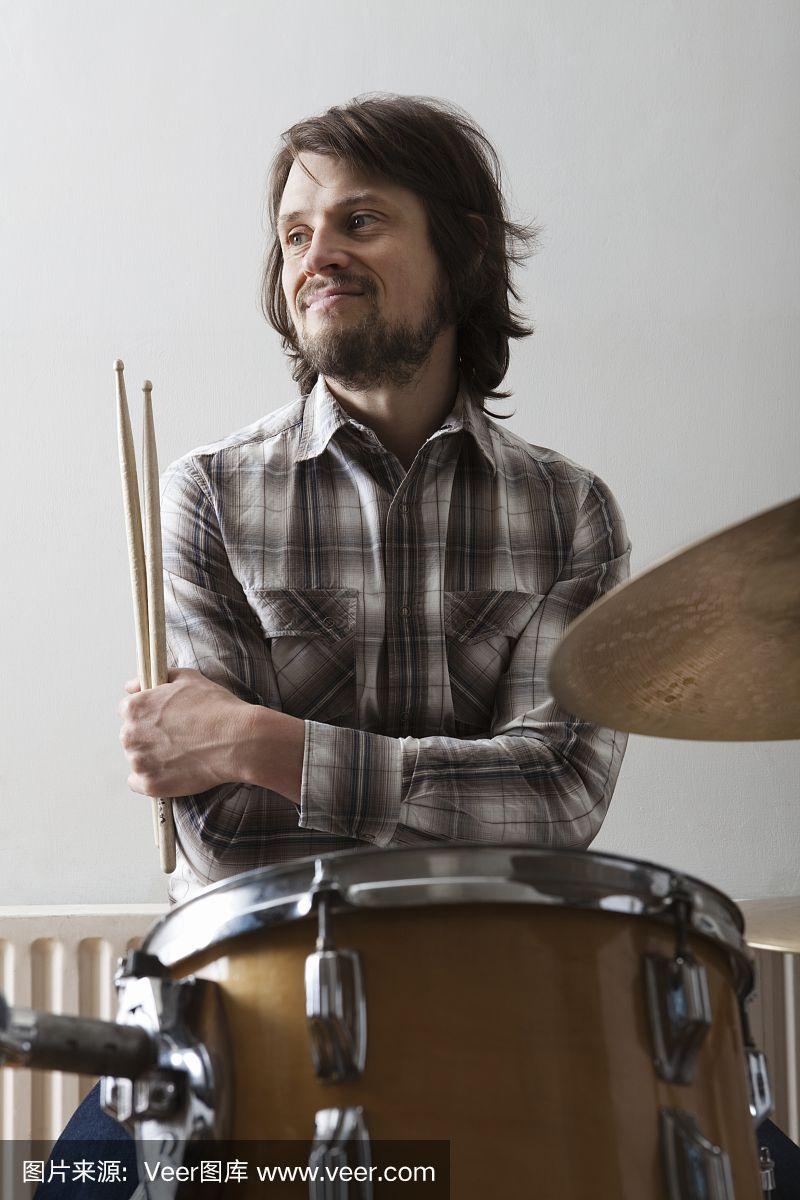 年轻人拿着鼓槌,双臂交叉靠近鼓点