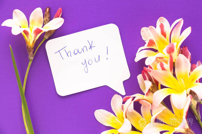 用"谢谢你" 的心形来说明, 用紫色的表面上的花朵