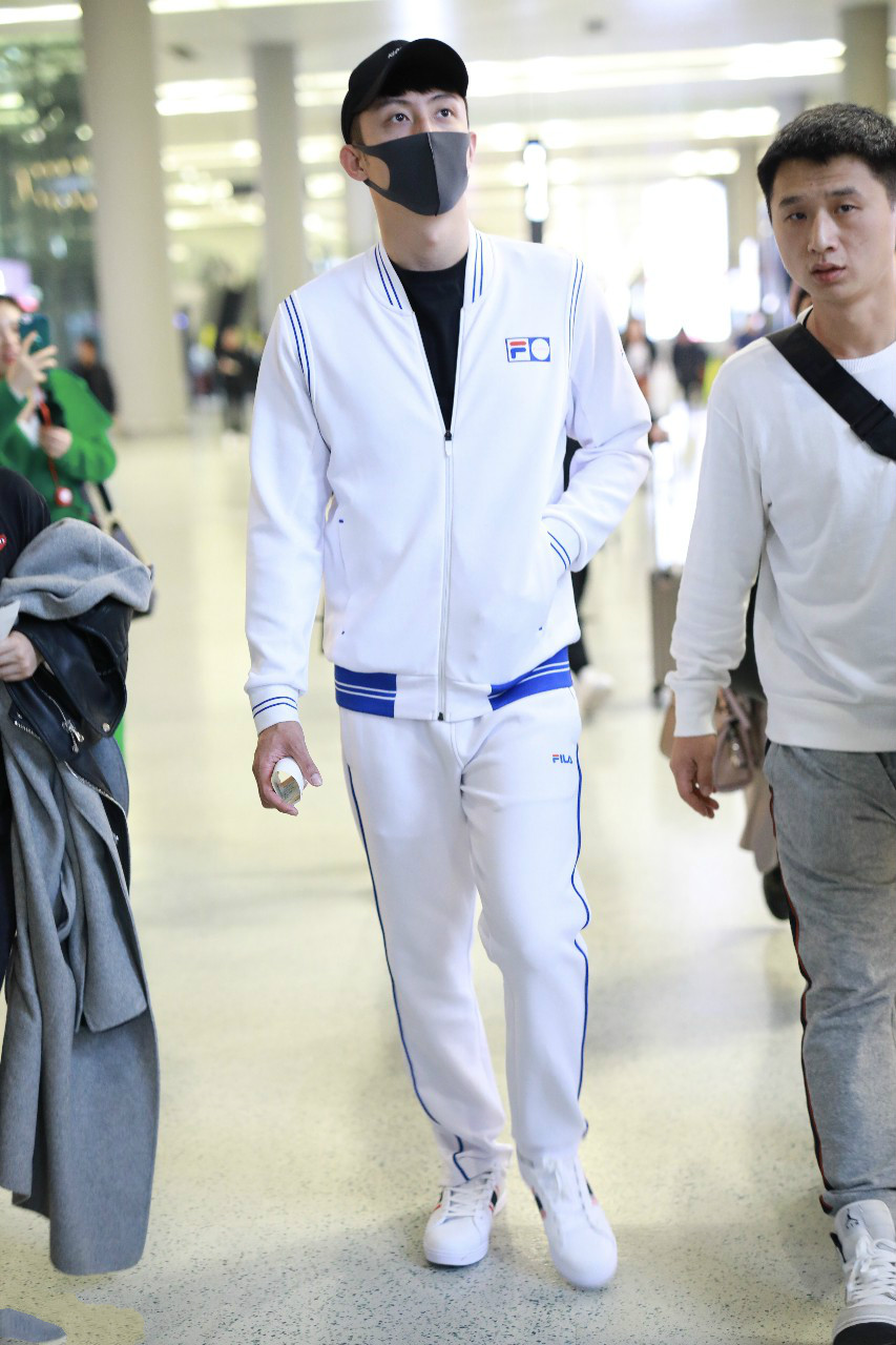 黄景瑜穿白色运动装现身机场,戴黑色棒球帽和口罩遮面