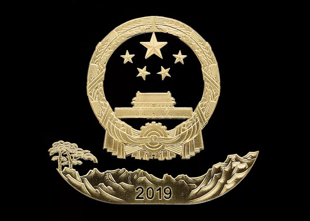 中华人民共和国国徽,中间是五星照耀下的天安门,周围是谷穗和齿轮.