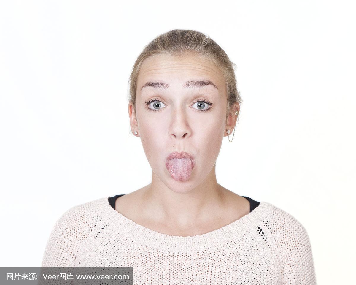 年轻的金发女人伸出舌头以有趣的表情高兴情感概念