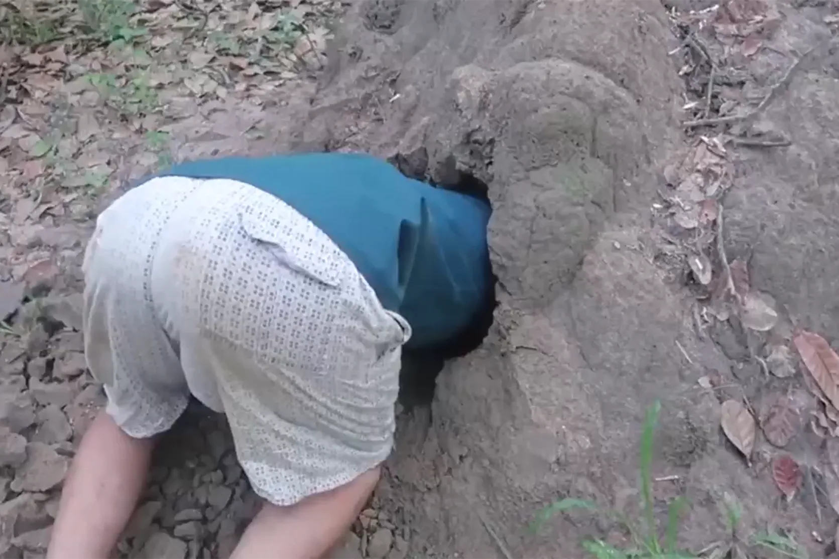 作死女子钻进地洞里抓鱼,而随后发生的事就让她尴尬