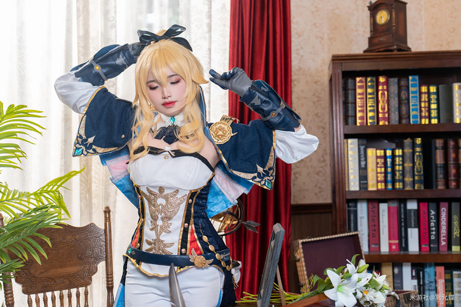 cos原神琴场照那一头金色的秀发在尾部做了卷让其知性优雅的魅力更添