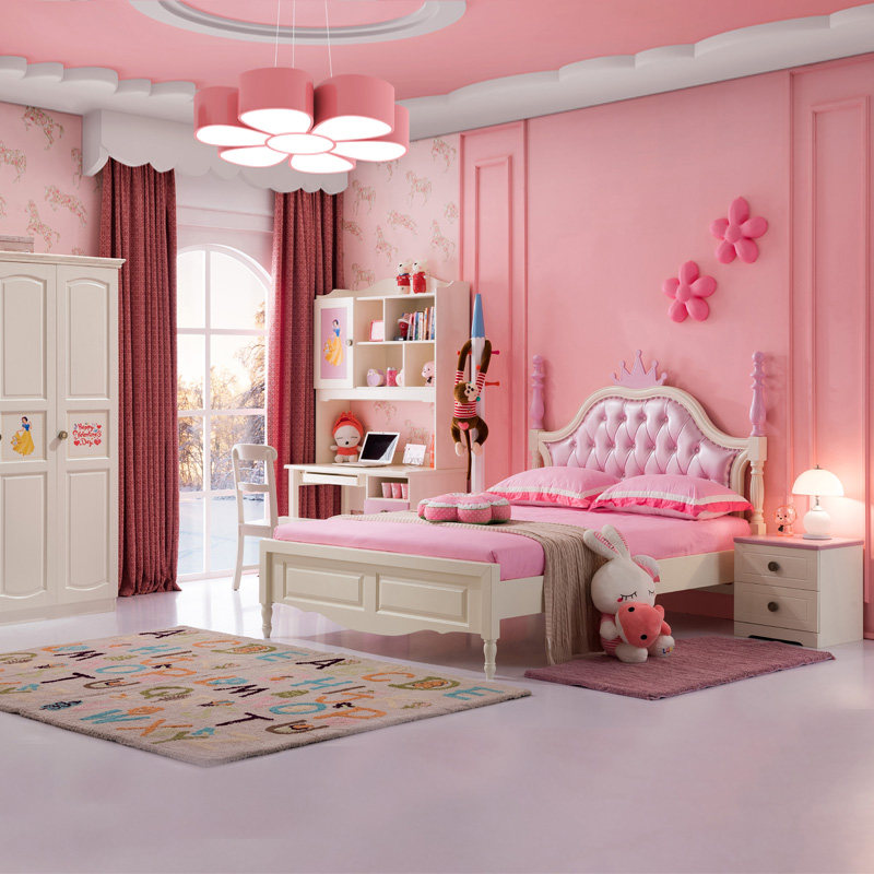 全实木粉色公主卧室房间成套家具带书桌衣柜 儿童房家具组合套装